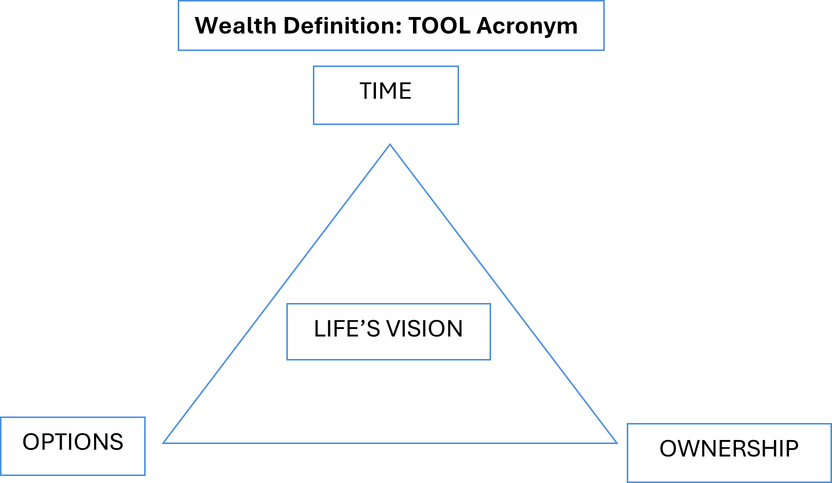 Think about the points on a triangle, with your life's vision in the middle. With time, ownership, and options, you can achieve your vision. And that is what wealth builds for you.